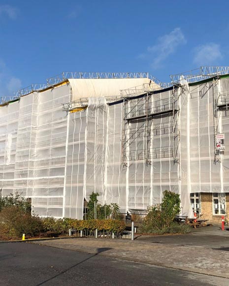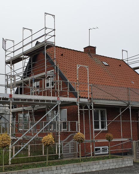 Med en totalinddækning med en 1.500 m2 arbejdsplatform har du mulighed for at bygge eller renovere uanset vind og vejr. Skal du have vasket eller udskiftet vinduerne på din førstesal, så har vi også stilladset til dig.